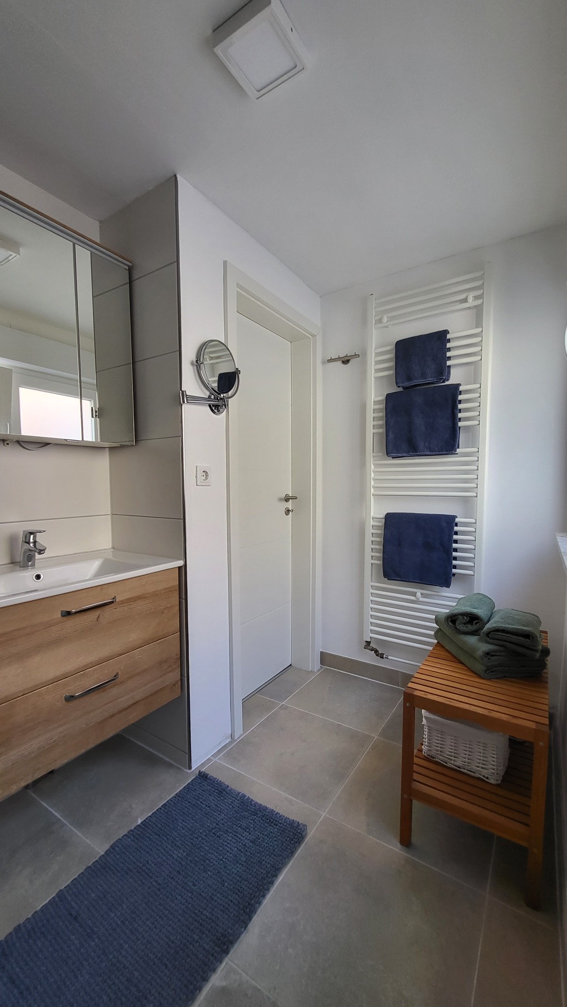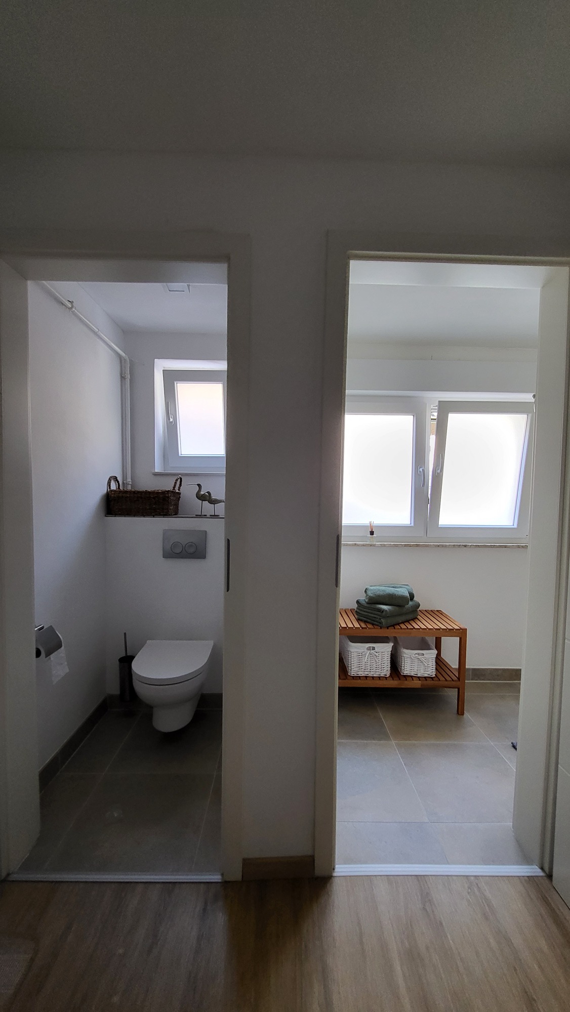 • Badezimmer unten mit einer Walk-in-Dusche und separatem WC